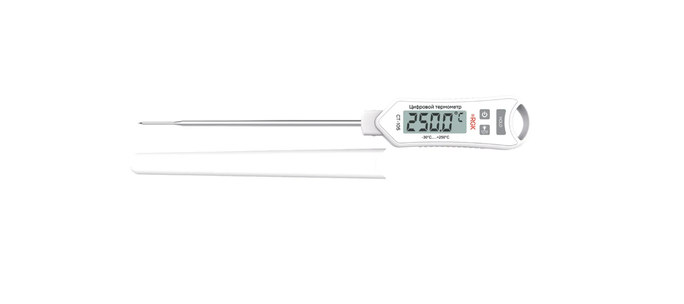 Термометр цифровой RGK CT-105 представляет собой компактный измерительный прибор в моноблочном исполнении, предназначенный для определения внутренней температуры материалов, продуктов и прочих целевых объектов с помощью погружного зонда контактным методом. Оболочка датчика изготовлена из химически нейтральной нержавеющей стали пищевого класса AISI 304, благодаря чему инструмент допускается для работы с продуктами питания. Удлиненный размер измерителя позволяет находиться на удалении от источников тепла при выполнении замеров, что делает данную модель оптимальным выбором для контроля температурных режимов при приготовлении мяса, рыбы, колбасной продукции и т.п.