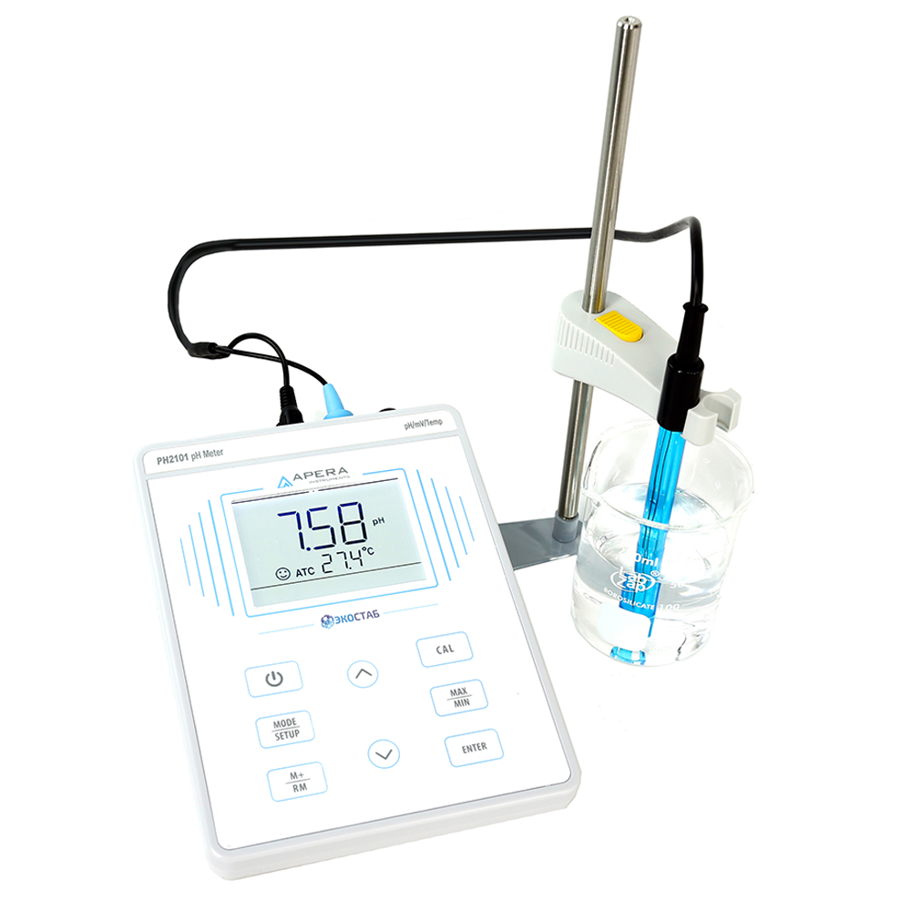 ЭКОСТАБ PH2101 – настольный рН-метр, оснащенный комбинированным pH-электродом 201T-F (3-в-1), имеет возможность одновременного измерения значений рН и температуры, автоматическую температурную компенсацию. Продвинутый режим автоматической калибровки с пошаговым руководством по калибровке и самодиагностикой, и усовершенствованная технология цифровой обработки сигнала помогает получать быстрые и стабильные показания pH.Прибор имеет степень пыле- влагозащиты IP54, прочный и надежный корпус. В памяти прибора может храниться до 50 записей. Модель поставляется с держателем электрода и калибровочными растворами. Комплект поставки: